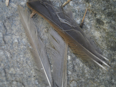 This morning I saved a tiny bird from the cat. He had brought it inside, and it was sitting on the bed in my guestroom/sewingroom/yarnstashroom, looking terrified, and the cat lurking next to it, just waiting for the bird to make a run for it so he could catch it again. It was a good thing I had already moved the cumulus from the bed! I took the bird and carried it outside, and locked the cat up, giving the bird a cance to catch his breath before it went on it's way again. The bird left these feathers behind. I hope he made it through and has learned to stay away from cats.